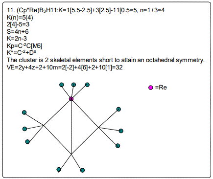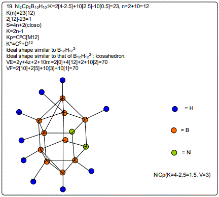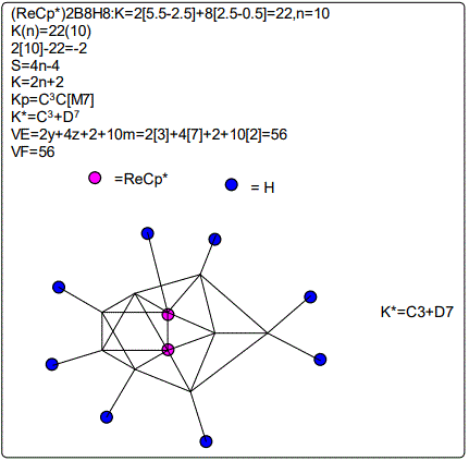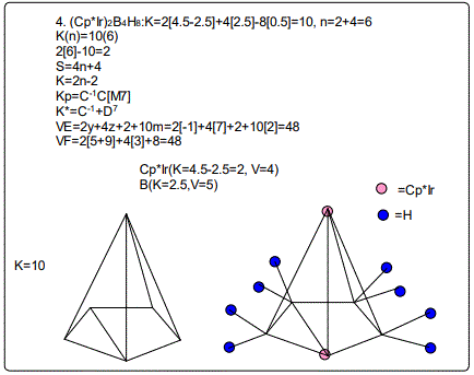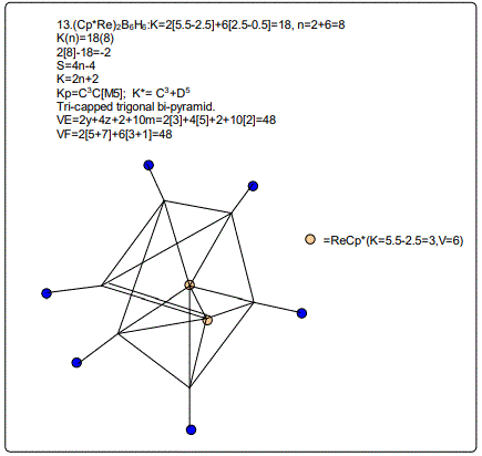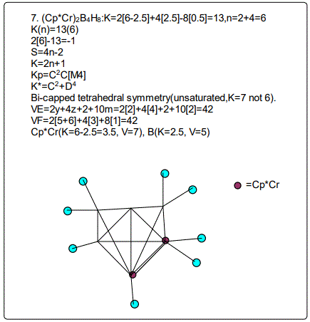 Let us focus on the case of the following clusters (Cp*M)2B4H8, M=Ir, Ru, Re and Cr as an illustration of the concept. The corresponding K(n) parameter and categorization parameter K* are as follows;10(6),C-1+D7; 11(6),C0+D6; 12(6),C1+D5;13(6),C2+D4. The K values for Ir, Ru, Re, and Cr are 4.5, 5.0, 5.5 and 6 respectively the K(n) parameter starting with K=10 to 11, 12 and then 13 for the same number of skeletal elements n=6. As can be seen, the number of skeletal elements remains the same while the value of the cluster number K increases. This results into the increase in the capping index while the nuclear index is decreasing. In the parameter K*=Cy+Dz and n=y+z. Since n is constant, the increase in y will naturally result in the corresponding decrease in z. Hence, the increase in the K value results in the increase of the capping index (the outer shell expands) and a decrease in the nuclear index (nucleus shrinks).