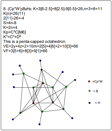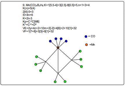 In the examples 1-7, the use of skeletal numbers to categorize clusters has been highlighted. A cluster is categorized into a CLAN series Dz and the family series Cy via the categorization parameter K*= =Cy+Dz. The same parameter can be used to calculate the cluster valence electrons VE=12y+14z+2 for transition metals and VE=2y+4z+2 for main group elements. The same parameter can be used as a guide to predict the shape of the cluster. For instance, K*=C0+D6, is an octahedral symmetry, K*=C1+D6 is a mono-capped octahedron, K*=C2+D6; bi-capped octahedron, K*=C3+D6; is a tri-capped octahedron and so on. Also a list of worked out examples mainly metabollanes from 1 to 22 were analyzed and categorized into clans and families and are given in table 2. Their graphical skeletal structures constructed according to skeletal valence principle: while they may involve inflated cluster valence electrons, they generate the correct cluster formulas, they act as a guide for predicting possible structure of the cluster, and above all, the capping cluster formula which is so accurate in determining cluster valence electrons, is based on the same principles.