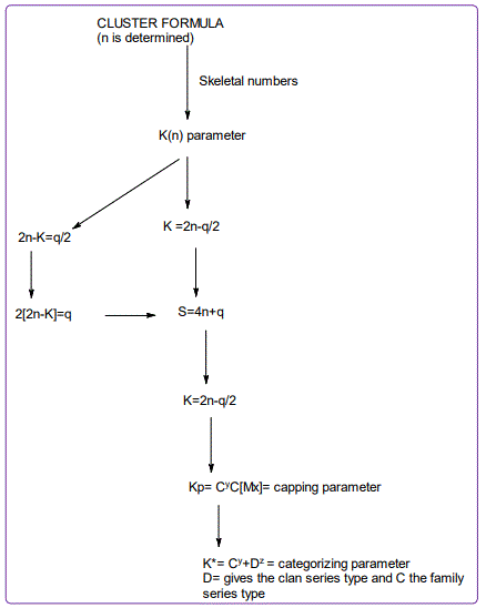 The first step in cluster categorization is to convert the cluster formula into a number. This approach focuses on the compounds or clusters from the main group or transition metals. This is now possible since each of the periodic group of elements was assigned a skeletal number as well as the ligands. The determination of the K value for a ligand is simple; LIGANDS: FOR EVERY 1 ELECTRON DONATED, K=-0.5 AND FOR EVERY 1 ELECTRON REMOVED, K=+0.5. So the cluster number K is readily calculated for any cluster with or without ligands. This is summarized in Scheme 1 and illustrated by in the following examples and worked out exercises most of them with detailed explanations.