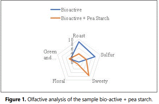 It must be noted that research studies have demonstrated that the brain process related to the taste and odour has a relevant degree of congruence between the two senses. So, the brain tends to twist cooperate in the formation of familiar sensory identities for the human being. This literature came in support of using a mixed terminology as sensory attributes (taste, odours) in the radar graph as such (see figure 1). Having said this premise, the author reported a distinct variation of the whole odour profile of the bio-active. This noticeable shift in sensory attributions was seen as an element to assume the modification of the background odour of the matrix because of the addition of the pea starch. Although the author found out a comparable effect (modification effect) with maltodextrin tested as an agent, however, it was not possible to graph all the results to showcase the overall effect in comparison to pea starch at this level of investigation [5,6]. Therefore, a further run of investigation may shed light on this hypothesized olfactive analogy. In must be kept in mind that, maltodextrins and pea search are chemically featured by the same molecules, albeit the two raw materials were sourced by two different plants by their respective manufacturers. Some of the differences in terms of chemical properties reported in the technical sheet give room to presume non-analogues effects.