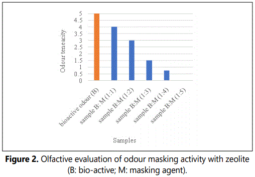 In the case of zeolite, the author evaluated that there was diminishing tenacity of the background odour related to the bio-active after the chemical agent had been added. As a result of this, the optimal quantity to achieve the desired odour masking activity was found satisfactory with a ratio 1:5 (Figure 2). However, the supposed proportional relationship must be analysed and supported by further with instrumental measures. The main obstacle related to the use of this agent is related to its low solubility in water-like systems. Zeolite not only showed to have an impact on the appearance of the sample (dispersion) but also raised a reasonable concern about the potential hindrance of the whole bioactive bioavailability as a consequence of the high concentration of this chemical entity. In fact, the bio-activeʼs capacity of freeing from this chemical once applied on the skin is a matter of concern.
