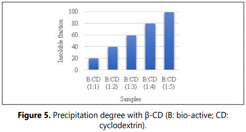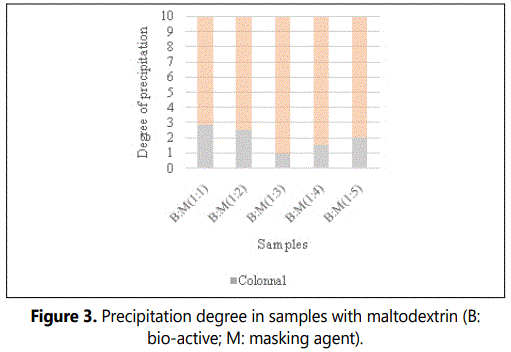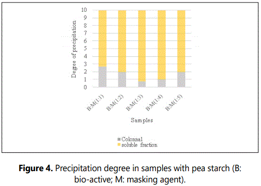The centrifugation test revealed that a degree of precipitation was found, yet minimal, in the test tube of each solution of the samples investigated. The presence of precipitate in the solution with the sole bio-active could be considered as to presence of impurities of the raw material. However, the complex solubility of the pattern of macromolecules of the bio-active brought up other stability-solubility questions. In light of the experiments conducted, the ratio precipitation had in samples with masking agents did not show a linear relationship. The author agreed that the least level of precipitation occurred both in the presence of a 1: 3 ratio of pea starch and maltodextrin (Figures 3 and 4).