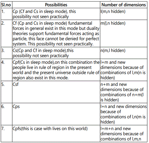 G-Cpfs makes C flexible or reversible, is meant for enhancing the +ve dimensions adding flavor or different expressions to C, Gh-Cpfs also flexible or reversible, is meant for enhancing -ve dimensions adding flavor or different expressions to C. D-Cpfs is meant for reducing the flexibility or reversibility of Cpfs in C is meant for particle, fundamental forces and soul respectively, which is put together because each C has the capacity to change themselves in either particle, fundamental forces and soul. When one is expressed other can go in sleep mode, they can exist as p,f,s individually or in combination. The possibilities can be given below in (Table 1). This table 1 explains the possibilities in this universe for Cp, Cf and Cs.
