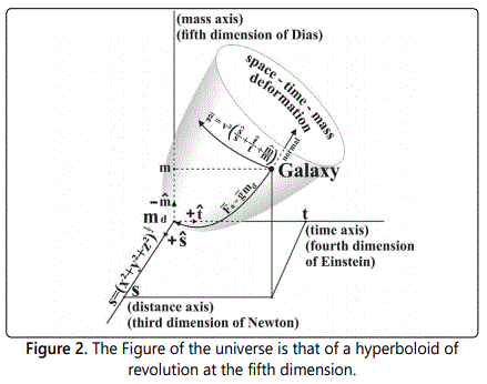 The Diasʼ Equation (10), which stems from Newtonian mechanics [1], is the mathematical representation of the figure of a hyperboloid of revolution (Figure 2), showing the galaxies gravitating around the black hole, which unifies the universe from its gravitational center filled with dark matter (md).