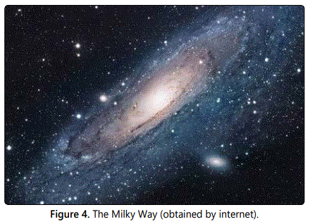 The equation (15) represents the electro-magnetic-photon effect of light [4], which clarifies the physical meaning of dark energy (ℑ) and dark matter (md). It is important to note that, without the fifth dimension, which is the mass, there would be no electro-magnetic-photon effect. Thus, the electro-magnetic-photon effect (equation 15) manifests itself when the light, which is at the same time electro-magnetic wave and particle, is plucked from the stars, on the cosmic scale, by the attraction power of the black hole, being transported by the dark energy (ℑ) there is at speed of light squared (c2) to the aforementioned black hole that exists in the gravitational center of the galaxy (Figure 3), where the light is definitively stored as dark matter (md), according to the equations (16 and 17).
