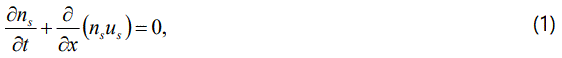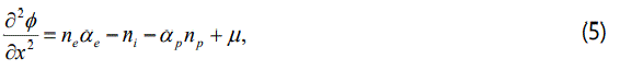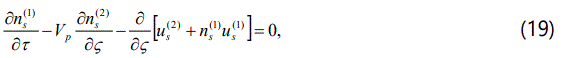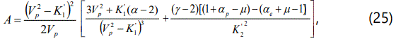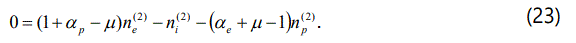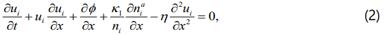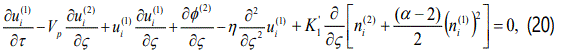 where μ is the ratio of the number density of negatively charged dust and ion (Zdnd0/nio) & μ=1+αp-αe,ns is the plasma number density of the species s (s = e for electron, i for ion, and p for positron) normalized by its equilibrium value nso(neo), us, is the plasma species fluid speed normalized by Cim=(mec2/mi)1/2 with me(mi) being the electron (ion) rest mass mass and c being the speed of light in vacuum, Φ is the electrostatic wave potential normalized by mec2/e with e being the magnitude of the charge of an electron, the time variable (t) is normalized by ωpi=(4πn0e2/mi)1/2 and the space variable (x) is normalized by λm=(mec2/4πn0e2)1/2. The coefficient of viscosity η is a normalized quantity given by ωiλ2mimsnso, and αe is the ratio of the number density of electron and ion (ne/ni) and αp is the ratio of the number density of positron and ion (np/ni). The constants K1=n0α-1Ki/mi2Ci2 and K2=n0γ-1Ke/miCi2=n0γ-1Kp/miCi2. The equations of state used here for the degenerate pressures of electrons, ions and positrons are given by