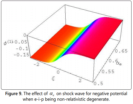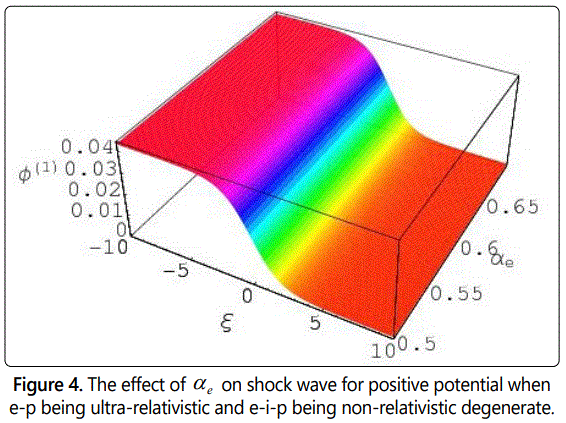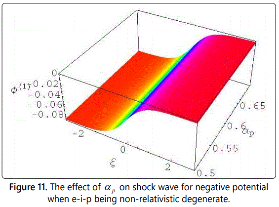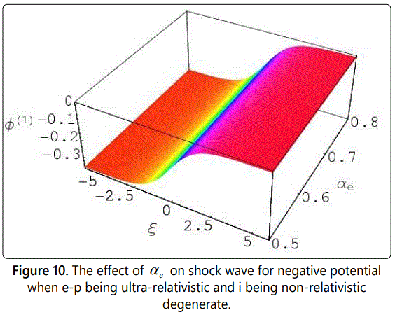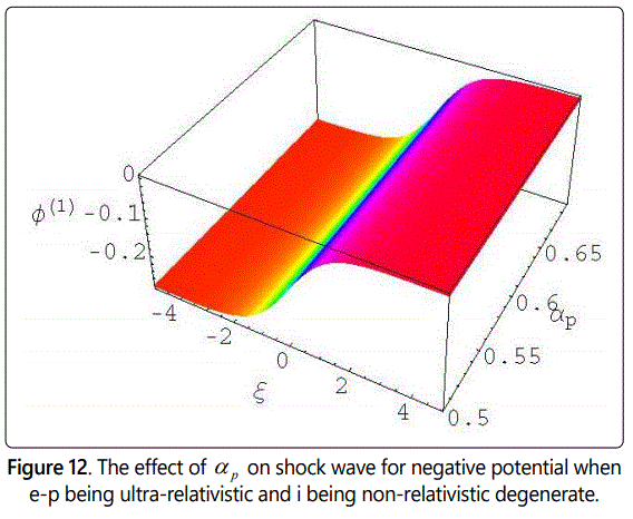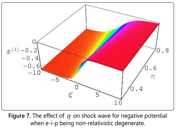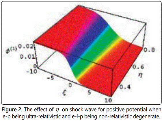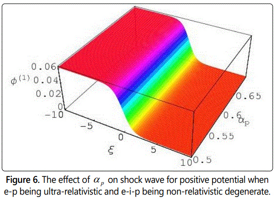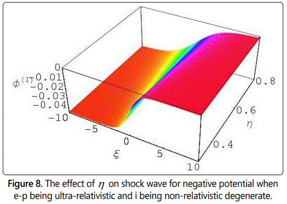 In figures 1-6 we have observed the effect of η, αe, αp, and μ on the potential structure with the variation of ξ in case of both non-relativistic and ultra relativistic limits. It has been observed when the values of μ is smaller than 0.82 (μ < 0.82) then we observe the formation of positive potential for the nonlinear structures of compressive shock wave in our considered degenerate plasma system. Again we consider the values of μ is greater than or equal to 0.82 (μ > 0.82) then we observe the negative potential for the nonlinear refractive structures as shown in figures from 7 to 12. It should be noted here that in both cases we keep all the parameters same so that it could be easy to analysis the effects of every parameter. The interesting point is that with the increasing values of αp and αe, the values of potential increases smoothly, but the increasing values of η the potential decreases smoothly. It should be noted that the formation of the compressive dust-ion-acoustic shock waves depends only on the values of the ratio of the electron number density and the ion number density (αe) and does not depend on the values of αp (the ratio of the electron number density and the positron number density). And the figures 1-12 also show us that the potential for electron-positron (e-p) being ultra-relativistic and ion (i) being non-relativistic degenerate is always greater than for electron-ion-positron (e-i-p) being non-relativistic degenerate.