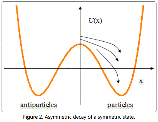 We show that this problem can also be solved on the basis of the entanglement of the expanding quantum system. Let us assume that the flying particles (condensate) with equal probability can decay into particles and antiparticles. In the absence of any asymmetry, the creation of a particle or antiparticle in this case is a random process (Figure 2). However, since particles (from which baryons are subsequently born) are entangled with one another, such a violation will occur immediately in the whole system, and not in its individual regions. That is, the resulting fluctuation will be significantly strengthened due to entanglement and will cover the entire system. Then the system will have either a matter or antimatter. If the entanglement between the original particles is not complete, then the predominance of matter over antimatter (or vice versa) will also be incomplete, but sufficient for the formation of baryons. As a result, after the annihilation of a part of the matter and antimatter, there will be an excess of one or the other.