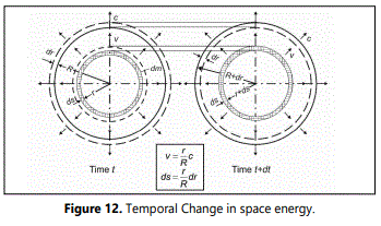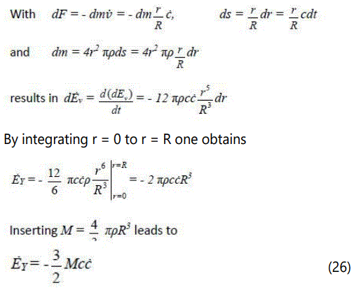 Which part of the total energy M is contained in the vacuum can be determined by a simple observation. The time gradient EV for the gravitational energy can be determined with the aid of an idealized model of the universe, in which all forms of energy are homogeneously distributed and expand at a speed proportional to the distance (Figure 12). The energy which is released in the radial direction (= one-dimensional) by the delayed expansion of the matter dm contained in a spherical shell with radius r and thickness ds and which transforms into space energy, is