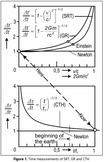 Henning Genz could also have agreed to this [4], p. 225: "The laws of general relativity are independent of the parameterization of time". Thus the time cycle would not only depend on the relative velocity (SRT) and the gravitational potential (GTR), but also on the time itself (CTH). A comparison of these dependencies is shown in figure 1.