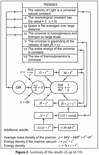 In this, M means the total gravitatively effective energy existing in the universe (M=E/c2). In addition to the ponderable mass, this also includes the radiation and vacuum energy. All these forms of energy are, as will be shown later, positive and contained in the energy pulse tensor of Einsteinʼs field equations. The further relations result from (4), (9) and (10).