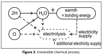 An example from chemistry (Figure 3) should serve as an illustration. When hydrogen (H) and oxygen (O) react chemically, water (H2O) and heat are produced, whereby the total energy for both states is retained, but entropy increases. The thermal energy generated during the reaction is called binding energy, which must be used to release the binding again.