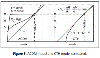By conventional view, universe expanding by equation (2) would be unstable. Cosmic expansion could only remain in unstable equilibrium, if besides R(t) also other quantities in equation (2) are time- dependent, like demanded by CTH (Figure 2).