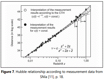 - The measured data obtained from observations of SNla supernovae, which suggest a currently accelerated expansion of the universe, result - if interpreted from the point of view of the CTH - in a slowed expansion, as required by the Einstein-de Sitter universe.