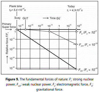 Such extreme events could possibly also be explained by the CTH. It requires that the expansion velocity of the universe (Ṙ=c) at Planckʼs time be greater by a huge factor of 1020 than it is today. In order to generate this enormous expansion velocity, the primordial, repulsive super force would indeed have had to have been unimaginably large, which seems quite plausible if one assumes that it had a similar course to the strong nuclear force at that time (Figure 10). Relative to the cosmic (real) time τ, this expansion process took place much more slowly than it did today.