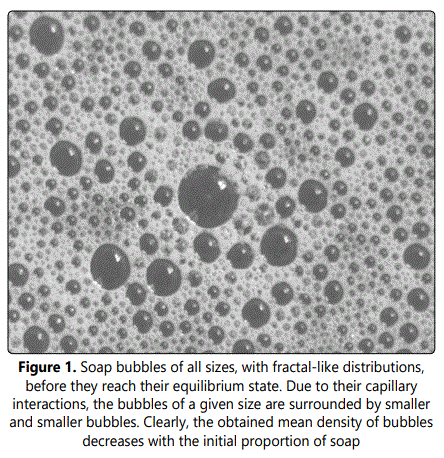 After finding the ideal composition of soapy material and liquid, we obtained an ensemble of bubbles that, due to their capillary interactions, self-organize slowly in the form of aggregates with fractal-like size distributions (Fig. 1). These configurations are similar to representations of the beginning of the evolution of a portion of galaxy of our U3D which, due to gravitational interactions also self-organizes from a homogeneous state into fractal distributions of matter (from star dust to stars) [1] [2], the 3D surface of which constitutes our observable universe.