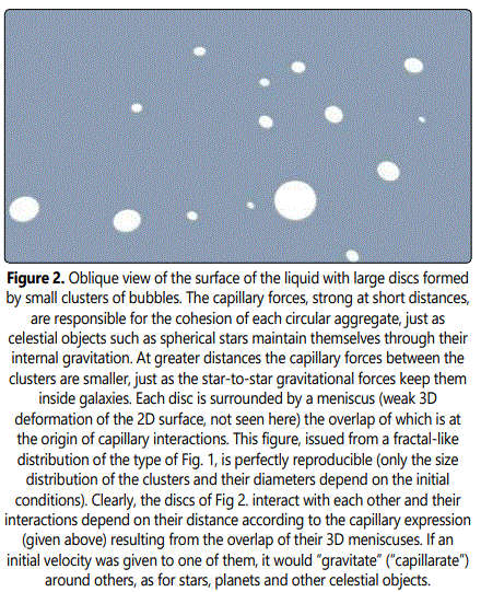 Another type of bubble distribution that is obtained corresponds to the case where a self-organized configuration of the type shown Fig. 1 gradually gathers to form larger and larger independent clusters with the shape of discs (Fig. 2). Such an evolution, also results from the capillary interactions between bubbles. This progressive transformation takes time and requires an initial smaller density of bubbles (i.e. of soap) i.e. a sparser initial fractal distribution of bubbles. In our analogy, this suggests that distant spherical stars and other celestial objects (analogues of the objects of Fig. 2) emerge in regions of the “universe” (here of Fig. 1) which are not extremely dense. Indeed, in our model, while extremely dense regions give rise to high concentrations of bubbles and of their clusters (e.g. large stars close to each other in our universe), more dilute regions give rise to the distant “stars” of medium sizes of Fig. 2.