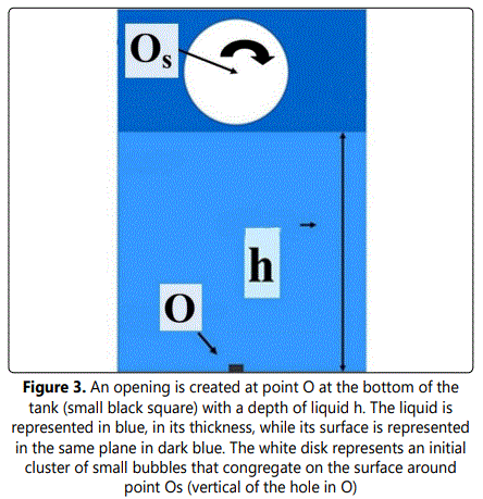 In fact, our simple simulation of a black hole is similar to the famous rotating Kerr black holes with their “accretion disc” which represent most of the black holes observed in our universe. Note that, the 2D halo (Fig. 9) implies a 3D accretion disk for a real black hole (i.e. filling the space between two concentric spheres). However, the pictures of Kerr accretion disks instead show, toroidal ring-like structures, a difference that is easy to understand and attributed to the abovementioned redistribution of angular momentum due to collisions that transforms spherical halos into nearly planar halos. Returning to Fig.9, the spinning velocity of the halos increases when h decreases i.e. when an increasing number of bubbles are transferred to the central disc, they also result from the conservation of the total angular momentum (disc plus halo) as is the case for real black holes with their accretion discs [12]. This transfer of matter from the halo to the deeper central aggregate is accompanied by a decrease in the radius of the latter to the benefit of the halo. More precisely, as h decreases the bowl (Fig. 9) increasingly deforms and sinks resulting in increased “verticalization” of its walls with subsequent decreased bubble density of the halo. When the walls of the bowl, almost vertical, are completely devoid of bubbles the halo turns black because it loses all its bubbles that are evacuated into the disc and the hole. The swallowing of the last small bubbles not visible scattered on the surface around Os, makes it possible to visualize the last tourbillon which will then be limited to the real dimensions of the hole at the bottom of the tank where the last bubbles are concentrated before being completely evacuated when h→ 0.