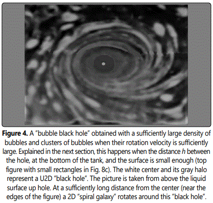We can see (Fig. 4) surface water motions around point Os situated at the vertical direction of the hole. These movements known to all, which transform themselves into whirls and tour billons absorbing the bubbles and clusters of bubbles (representing stars, planets, etc.) constitute the black hole of our U2D. This “black hole” appearing at the center of (Fig. 4), is surrounded at larger distances, by its 2D “spiral galaxy”.