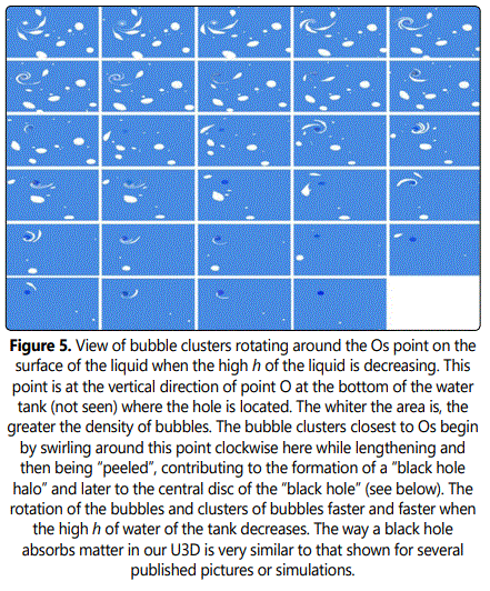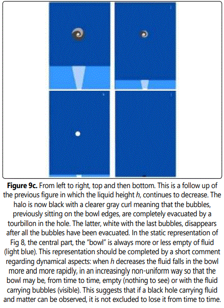 More generally, the different stages of black hole configurations observed in Fig 9. seem to correspond, in our U3D, to different types of Kerr black holes [13]. In particular, the fact that the speed of rotation of the central disc representing the center of the black hole in Fig 9 a,b. accelerates when h decreases suggests that, in our universe, the speed of rotation of the central part of Kerr blacks holes could be different from each otherʼs, depending on the distance to their assumed escape point. In addition, the diameter of this central aggregate being much larger than that of the real hole drilled at the bottom of the tank (which an idea of size is given by Fig 9. when h→ 0, last schemes), suggests that what one sees of a black hole of our universe is much larger than its supposed escape point.