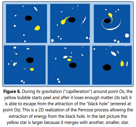 To show more clearly how the matter is absorbed by the “black hole” a more extended view of the black hole (in Os) with surrounding bubbles and clusters of bubbles is given Fig. 5. All these floating objects rotate and deform themselves according to spirals ending at point Os, being peeled bubble by bubble or small cluster by small cluster. Note that due to their strong internal capillary forces making them more compact, the largest clusters rotate with longer periods of time which, however, become faster as they move closer to point Os before being also dragged and absorbed. These pictures accurately represent the way real black holes absorb matter in our universe. In particular star peeling constitutes a well-known mechanism for the absorption of matter by black holes [3]. Interestingly, one can see that such a rotational movement of matter far around the central point Os may constitute an indirect mechanism for the detection of a central black hole that would be invisible due, for example, to a complete lack of matter in its close environment. Indeed, if a black hole absorbed all the matter around without being fed it would no longer be visible, the surface gravitational fluid that it carries, without matter beeing no visible (dark not visible (dark blue point on the second half of the images of Fig. 5, for details, see section 5). After a sufficiently long time, when bubbles and clusters of bubbles (matter, stars in our U3D) start again to gravitate around the black hole and be absorbed by it the black hole should gradually become increasingly visible. After even more time a new galaxy of bubbles can be regenerated (returned to the first images of Fig. 5). These U2D observations provide a simple possible interpretation for the successive appearance and disappearance of black holes, and even of galaxies. Research is underway on this topic, of the galaxy Abell 2261 [4].