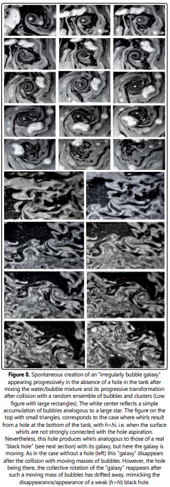 Fig. 8 down (large rectangles), shows how in our 2D experiments, a galaxy can be born and move before it disappears, in the absence of a black hole as observed in our universe [8]. This was obtained by observing the collective motion of an ensemble of bubbles and clusters of bubbles achieved after mixing water and soap locally for a few seconds. The 2D “galaxy” does not appear systematically but, when this is the case, in addition to its own overall rotation, it moves slowly following the random walk of its center. Such a galaxy, not linked to a hole can also be drained by other types of water currents (different from those initiated at the beginning of the experiment) due to the bubbles and aggregates sitting near the edges of the tank which represent the motion of stars and other celestial objects sitting in the environment of a real galaxy. These conflicting currents ultimately lead to the disappearance of the galaxy due to the loss of its collective angular moment. We also observed that the usual type of galaxy built around a “black hole” observed in our experiments if we drill a hole at the bottom of the tank (Fig. 8, up, small rectangles) for details see next section) can also move, disappear, and even in this case, reappear[9]. This figure also shows that our 2D “black hole” sitting at the center of its “galaxy” moves in a region no longer vertical to the hole. This situation appears when the distance h between the liquid surface and the hole is larger than a characteristic distance (h>hi, see next section) for which the liquid surface is not strongly connected to the hole, allowing an oblique aspiration whose direction is sensitive to the parasitic currents circulating around the galaxy. This results in a random but limited, motion of the 2D “black hole” (“wandering black holes” [9]) taking place in very turbulent regions of our universe such as near supernovas or in the proximity of black hole collisions. Then, after waiting even more time the random water currents decrease in intensity to eventually disappear allowing the “galaxy” and its collective motion around its “black hole” to refocus near the vertical direction of the hole allowing the surface 2D “black hole” to reappear (Fig. 8, upward, small rectangles, last image). Such a “reappearance” is observed when the distance h decreases below the critical value hi, suggesting that the observed mobility of a black hole may depend on its distance to its escape point (see next section). By the end of this paper, we shall see that we may provide other mechanisms explaining the similar appearance/disappearance of well-connected black holes when h<hi.