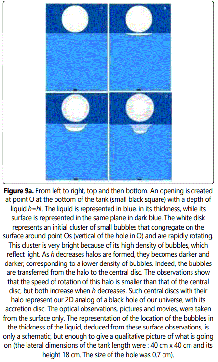 Let us now come to the inner structure of black holes, as suggested by our analogy. Fig 9. shows that, around the bowls, the 2D liquid surface presents a 3D negative curvature created by the whirls and tourbillons at the vertical direction of the point O. Following our analogy, the 3D contour of real black holes of our universe, made of heavy fluid and matter, should show a similar 4D negative curvature while their centers plunge more or less into the 4th dimension. Such immersions near or even into the 4th dimension depend on the value of the length h in our experiments. Such negative curvatures of the heavy fluid on the contour of the central object (the black hole) recall the positive curvatures on the contour of bubbles (capillarity menisci) and of their equivalent positive curvatures on the contour of masses (Einstein gravitation “vacuum curvatures”) suggesting a possible common origin in a generalized dynamical Einsteinʼs spacetime theory… In any case, the central part of black holes, belonging to a region close to the 4D space (or in it) should not be accessible to us except if the “bowl” is accidentally empty of 4D fluid (see below). Fig 9 shows that this effect is less pronounced, when the distance h is larger suggesting that the central part of black holes associated with large h may be less easily visible than the others. If h is larger than hi, the black holes become “weak” and can move as discussed above (see also Fig 7). Clearly, in our experiments the 3D earth gravity, acting on the bubbles of the 2D surface of our water tank, plays the role of the 4D gravity of the heavy fluid filling the inaccessible part of our universe acting on the masses of its 3D surface (our visible universe). Interestingly, this picture solves the problem of missing dark matter.
