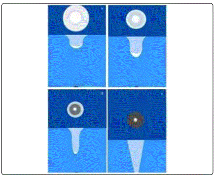 Figure 9b. From left to right, top and then bottom. This is a follow up of the previous figure in which the liquid height h continues to decrease. The regions in lightest blue are inside the tourbillon, with less liquid and splashes (not seen, but easy to imagine). Here one can see more clearly why the halo around the central disk becomes darker and darker (until becoming black) and larger and larger: it corresponds to what is seen from the surface of the walls of the “bowl” where the bubbles are located. When h decreases, the density of bubbles decreases because the bowls walls become increasingly deeper and more and more vertical. The lightest central part is white because this is where most bubbles accumulate, at the bottom of the bowl, below the surface. Note that, for more visibility, this figure exaggerates the actual depth of the “bowl” that we could not measure precisely.
