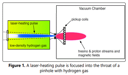 It is expected that laboratory-experiments observing the tresino phase-transition will generally be of two types: Those by design and those by “accident”. In the first case, there can be many possibilities depending upon a laboratoryʼs source of energy deposition. One such example is presented in Figure 1 below where a laser-heating pulse is focussed into the throat of a pinhole aperture through which hydrogen gas has been allowed to flow into a vacuum chamber. The laser wave-length and pulse-length will have to be adjusted along with the gas flow rate to achieve access to the tresino phase-transition temperature and the phase-transition density. When successful, the phase-transition releases the tresinos “binding energy” as streams of tresinos and protons and their associated magnetic fields. Among other detection methods, the exhaust streams can be monitored by pick-up coils surrounding the exiting “plume”. In the second case, the phase-transition by “accident”, it is possible that the tresino phase-transition has already been “accidentally” encountered in laboratory hydrogen-plasmas but has not been recognized as such, except that some extra energy may have been observed.