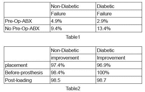 Discussion and Results: Hyperglycaemia have been shown to alter normal process of ossiointegration by inhibition of osteoblastic cell proliferation and collagen production, Prolonged hyperglycaemia may result in delayed wound healing around dental implant and osseointegration due to altered metabolic rate While, the time required to achieve 100% level of healing, patients with high level of HbA1c ≥ 8.1% required about twice the time to return to baseline levels compared controlled and non-diabetic patients. Some articles shows better success rates of dental implant treatment regardless diabetic control level. By following a restricted protocol includes antibiotic course and CHX (0.12) mouthwash. Preoperative antibiotic usage showed a favourable improvement in implant survival (Table1)