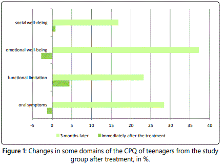 2. Three months after dental treatment there was an improvement in the quality of life as a whole as well as per all the domains of the CPQ, namely, in oral symptoms, functional limitations, emotional well-being and social well-being.