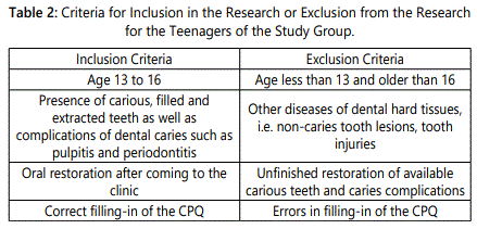 Additionally, 112 teenagers, who came to the Dental Clinic of the Department of Pediatric Dentistry of Moscow State University of Medicine and Dentistry (MSUMD) for dental treatment, were examined. Dental caries and complications were diagnosed in all the examined teenagers (Table 2).