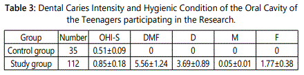 The data of the analysis of dental caries intensity and of hygienic condition of the oral cavity of the teenagers who took part in the research are given in table 3.