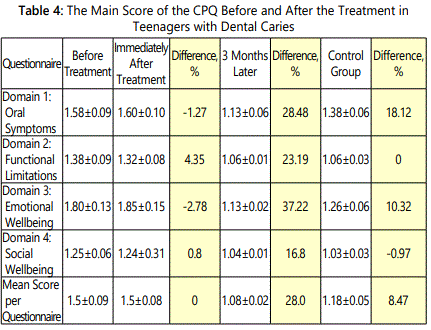 In the course of the comparative analysis of the CPQ parameters in teenagers with dental caries before and after treatment, we found that immediately after curative treatment the mean score of the questionnaire had not changed (the difference is 0%). Three months after the restorative treatment, this parameter improved by 28.48% (from 1.5 to 1.08 points). The perceived changes suggest an improvement of the quality of life of the surveyed teenagers only three months after completion of the restorative treatment.
