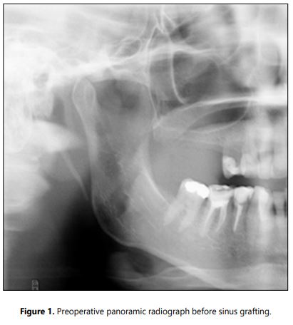 The particulate graft was previously immersed in a sterile saline solution and suddenly packed into the sinus. The mucoperiosteal flap was sutured and primary closure was attained. The patients were medicated with 1 gof amoxycillin + clavulanic acid Augmentin® (GlaxoSmithKline, Middlesex, UK) every 12 hours during one week after maxillary grafting. To control the inflammation and the pain after surgery was administered orally 400 mg of Ibuprofen Apo-Ibuprofen® (Apotex Co. Toronto, Ontario, Canada) every 8 hours during five days. During two weeks after surgery the patients rinsed their mouths out with 0.12% chlorhexidine digluconate twice a day. After two weeks the sutures were removed.
