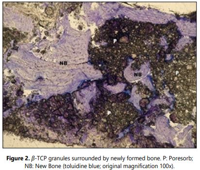 Histology: No signs of foreign body reaction and inflammatory phenomena were observed in any of the samples. Remnant of β-TCP was present in all of the cases (Figure 2). These particles were surrounded by osseous and/or connective tissue. The newly formed bone was predominantly lamellar (Figure 3). All the samples were harvested after six months healing graft period. The obtained data are showed in the table 1.