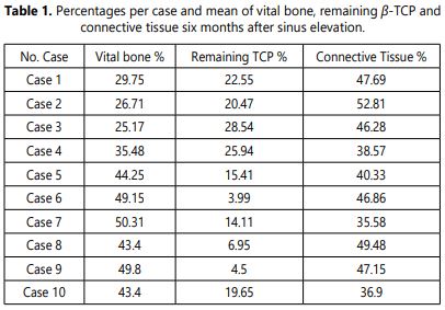 Materials and methods: A total of 72 two-stage sinus lift were performed in 54 patients during 2007 to 2010. The autologous bone was harvested from the mandibular ramus and mixed with the β-tricalcium phosphate Poresorb® TCP sized 1-2 mm. The materials were used in a proportion ranged between 1:1 and 1:3. After the healing period a total of 119 implants were placed and 10 samples of the regenerated bone were collected for the histomorphometric analysis. CBCT or panoramic X-rays were performed presurgically, before the implant placement, six months after implant placement and then yearly to evaluate the bone formation and marginal bone loss. The implant success rate was determined using the Albrektsson et al. Criteria.