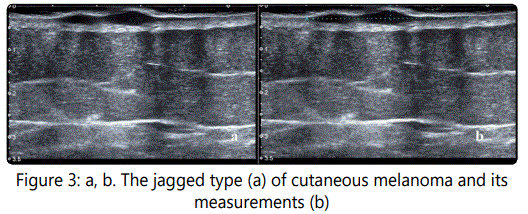 Analyzing all 27 cutaneous ultrasound images we clearly found two main types of melanoma mass shapes: nodular (Fig 1a) and superficial (Fig 2a). Definition and thickness measurements in both groups are quite easy (Fig 1b, 2b). In some superficial or linear shape types of malignant melanoma, we found also intermediate cases with the part of the tumor starting its asymmetric vertical jagged growing (Fig 3a). This jagged type can be in any place of the superficial melanoma: in the middle, in the end, or in one or two parts of the linear shape of the mass. The measurements had to be appropriate and included its deepest part (Fig 3b). Taking into consideration not only the radiological aspects but the clinical point as well, it is more convenient to analyze the cutaneous melanoma group according to 3 shape types of tumor: oval shape, jagged shape, and linear shape. We also registered the ratio between the diameter of the mass and its maximal thickness - L/T ratio.