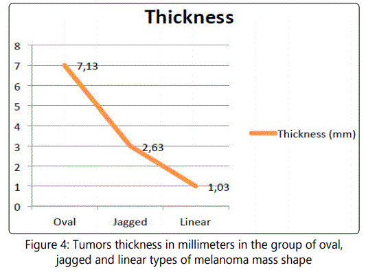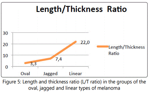 One of the most important characteristics for malignant melanoma is the tumor thickness correlated with tumor shape (Fig 4): it was maximal in the oval group, intermediate in the jagged and low in the linear group. The inverse pattern was noted in L/T ratio: the number was low in the oval group, intermediate in the jagged and maximal in the linear group (Fig 5).