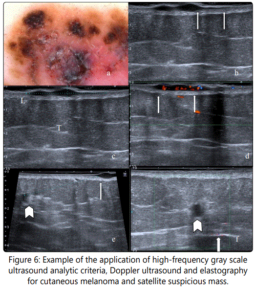 The most significant melanoma ultrasound criteria are: sharp well-defined margin, hypoechoic mainly homogenous structure, retro mass acoustic enhancement, hypervascularization in different types of Doppler examinations, more than one peduncles, also high L/T relations and high strain elastography stiffness. The results can be discussed according to the resolution of the used linear probes, their pros, and cons, estimation of changes of the superficial type of melanoma to the more invasive or aggressive types of melanoma: jagged and oval shapes.