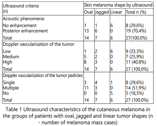 Analyzing ultrasound acoustic phenomena in the cutaneous melanoma group a posterior enhancement in main cases were found (Table 1). The posterior enhancement was quite regular in the oval shape group, less frequent in the jagged and there were no registries in the linear group. Doppler vascularization of the tumor was high in the group of an oval shape, medium in the jagged group and low in linear types of melanoma mass shape. The number of the tumor peduncles vascularization decreased in the group with oval, jagged and linear types of melanoma mass shape.
