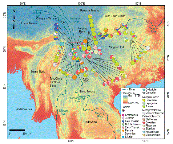Fig. 1. Ages distribution of detrital zircons from the Lanping Basin and neighbouring areas. Pies with colours mean different peak ages of detrital zircons shown as the legend, and the area ratio of pies show percentage of the peak age in one sample. The position of the pies is where the clastic samples were collected.