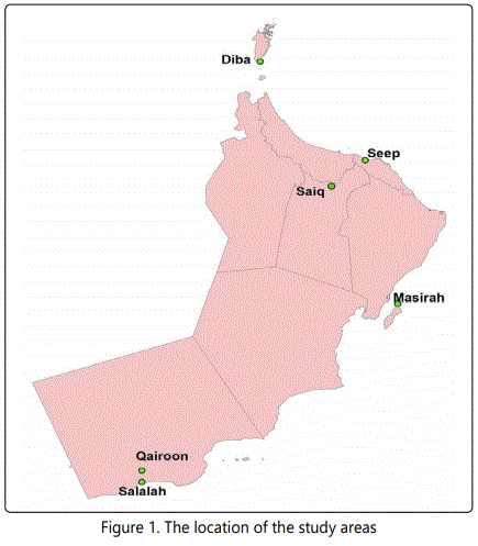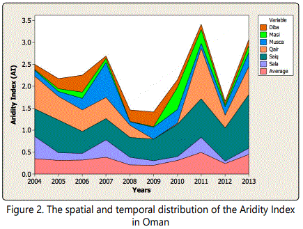 The Aridity Index (AI) is a widespread and simple tool that allows the opportunity to analyze the magnitude of the aridity and drought phenomena all over the national territory for a reasonable number of years (2004–2013). In addition to the absolute values and relevant climate classifications, the AI has allowed us to verify geographical characteristics and differences as well as occurrences in climate variations. Figure 1 shows the selected regions for the study. Considering the overall deterioration recorded during the last 9-year period, the most serious aridities phenomena affect only part of the Omanian territory (e.g., Qairoon and Masira) and marginally other southern regions. In these areas, the environmental conditions are more unfavorable, where vegetation, grazing, and other human activities affect local environmental conditions. Indeed, the increase in aridity has changed the status of the natural resources affected by the production activities, in particular soil, vegetation, and water resources. The data provided in this paper points out how Oman was affected by various degrees of water stress, mainly due to scarce or badly distributed rainfall throughout the year. The increase of bare soil or cover with sparse vegetation creates an increase of solar radiation. Consequently, the more the soil moisture evaporates, the more the ground becomes drier in a feedback process possibly, accelerating degradation of the Omani lands. In conclusion, considering all the mentioned facts, it should be kept in mind, that agro-ecosystems are the result of the adaptation to specific environmental conditions (climate) and any variation, which could alter the ecological and biogenetic balance. In which, needs to be reoriented in the name of sustainable land management policies and vegetation practices.