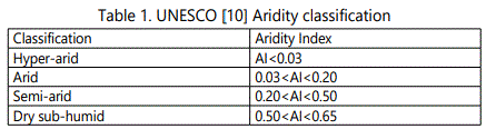 The most commonly used aridity index is however that proposed by UNESCO [10] which is based on the ratio of annual precipitation (P in cm) and potential evapotranspiration (ETp). Thus we have