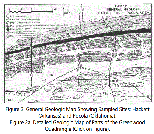 Briggs et al. [18] indicate that this section is approximately 2,600 feet stratigraphically below the top of the Atoka Formation. Thrust-faulted contacts are mapped in the lower part of the Pocola outcrop (See figure 2), but were not apparent in the field. The sandstones of the Pocola Section are within Zone “W”, as after Haley [2].