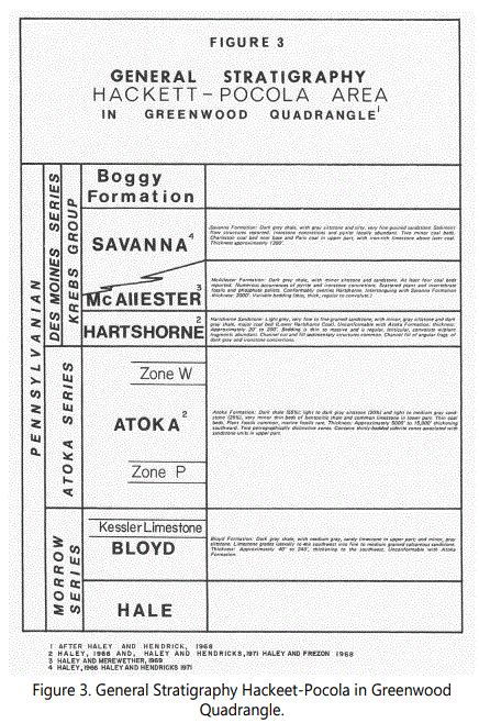 The regional geology is illustrated in figures 2 and 2a. The stratigraphy in the area is presented in figure 3. Haley [2] and Ballard [99] reported that parts of the Atoka Formation have distinctive lithologic characteristics. He defined two zones: Zone “P” near the middle of the formation and stratigraphically below the Hackett and Pocola Sections; and Zone “W” in the upper third of the Atoka (approximately 2,600 feet from the top of the Atoka) and approximately 400 feet thick, composed predominantly of thin- to medium-bedded sandstone with minor siltstone and shale. The upper sandstone units of the Pocola Section are in Zone “W” (See figure 2).