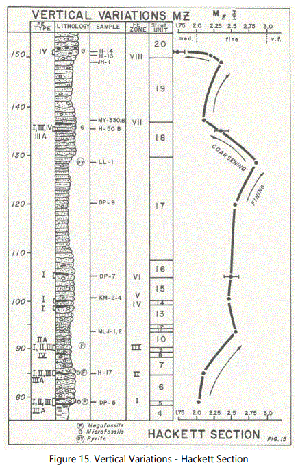 Sampling objectives for the study of the textural characteristics of the lithologic units examined were: 1) define apparent transition zones, 2) characterize “typical” samples from certain intervals of interest; and 3) examine the vertical variations in Mz values to the extent the data permit. Figure 15 is a summary and vertical comparison of the data over a 75-foot interval (Units 5 through 20). The Graphic Mean (Mz) is shown with respect to the vertical location of the ferruginous zones and types to be defined later. Error bars for three samples are also shown [21].
