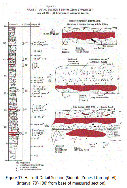 - Macro-fossiliferous siderite zones are less numerous at Pocola than at Hackett;