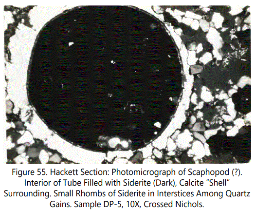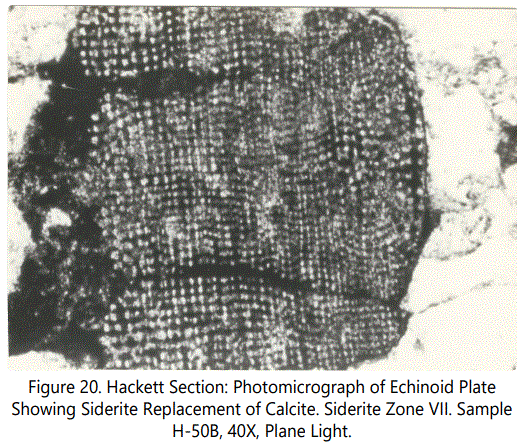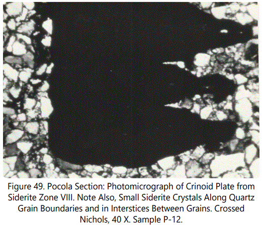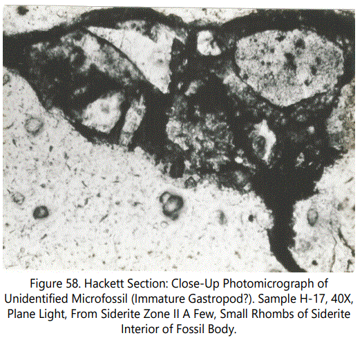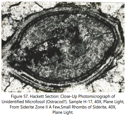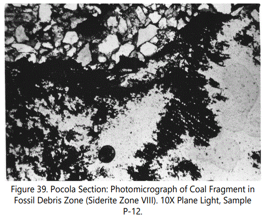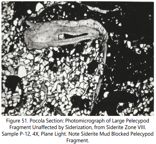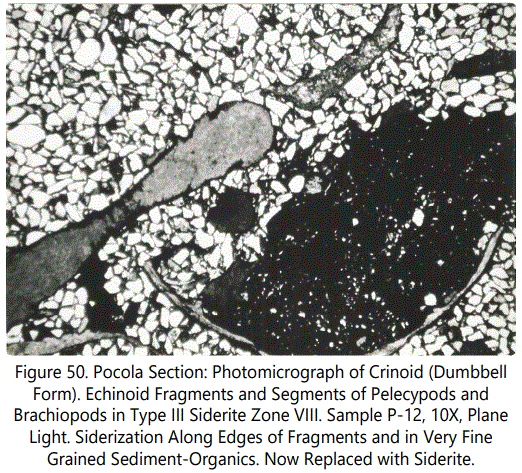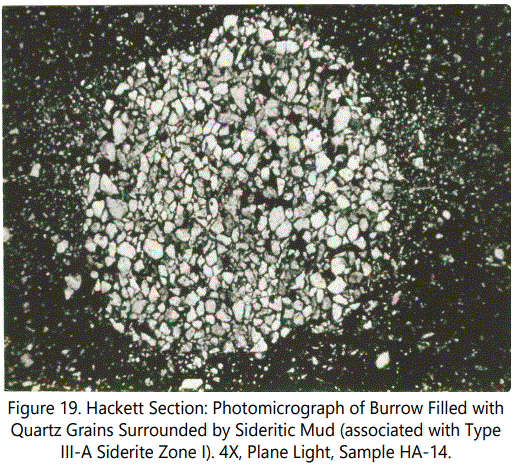 One critical problem regarding the genesis of siderite is whether the zones now occupied by siderite were in fact previously occupied by organic material syndiagenetically altering to siderite with an intermediate precursor of chamosite and/or pyrite, or were primary sites of iron carbonate accumulation. Evidence to support either process is in direct, but present physio-chemical theory seems to preclude a primary or syngenetic process of direct precipitation of siderite at the depositional surface under marine conditions. If the siderite can be shown to be a primary chemical precipitate, then a lagoonal or tidal-flat depositional environment can be inferred for at least some of the intervals of the Hackett and Pocola Sections. Other sequences can be interpreted as indicating a paralic or intradeltaic depositional environment. It is toward the solution of this problem in interpreting depositional environment that the following lithological, textural and mineralogical descriptions are directed.