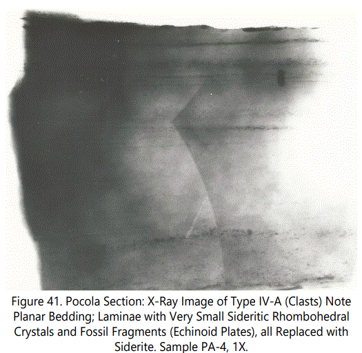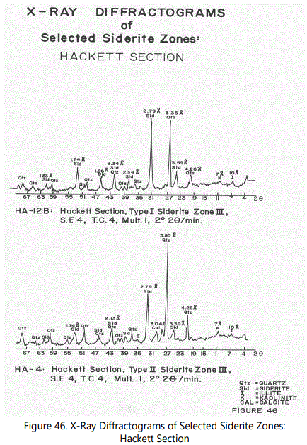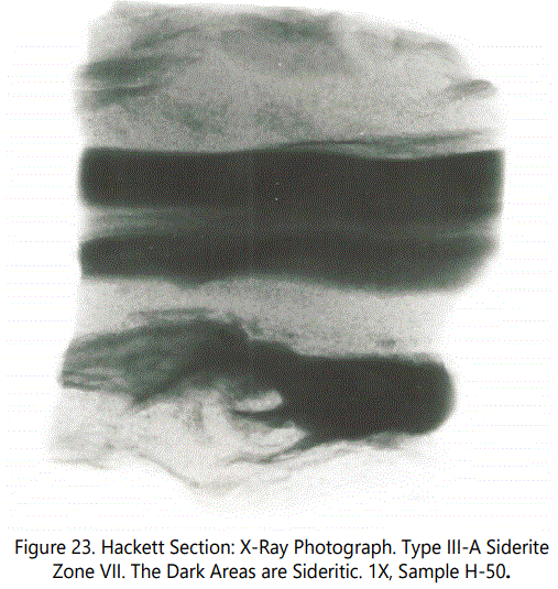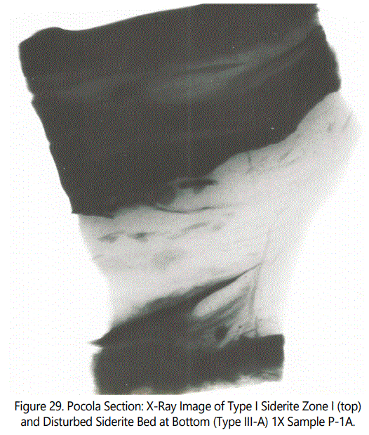 Discussions involving the genesis of siderite should include considerations of its natural remanent magnetism and of the nature of its oxidation during thermal treatments [97]. Most work have been conducted on high-purity siderite samples, but the subject Type I siderites are not of high-purity FeS, but contain other metals as well as silicon (SiO2) (see table 13). These may serve to fix any remanent magnetism at some time during consolidation of the Type I siderite band.